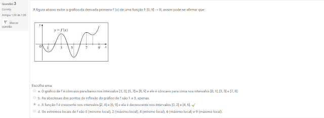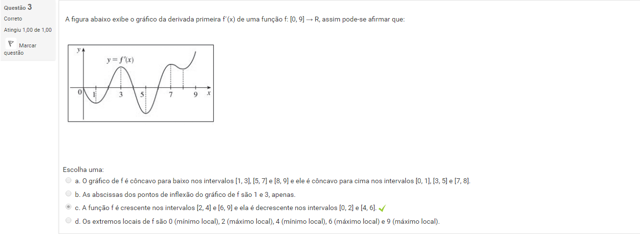 3 A figura abaixo exibe o gráfico da derivada primeira f´(x) de uma função f: [0, 9] → R, assim pode-se afirmar que:
