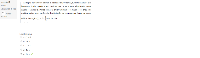 3 As regras de derivação facilitam a resolução de problemas e auxiliam na análise e interpretação de funções, e em particular favorecem a determinação de pontos máximos e mínimos. Muitas situações envolvem mínimos e máximos de áreas que auxiliam, muitas vezes, na decisão de otimização para embalagens. Assim, os pontos críticos da função f(x) = x³ - 3x + 2 são: