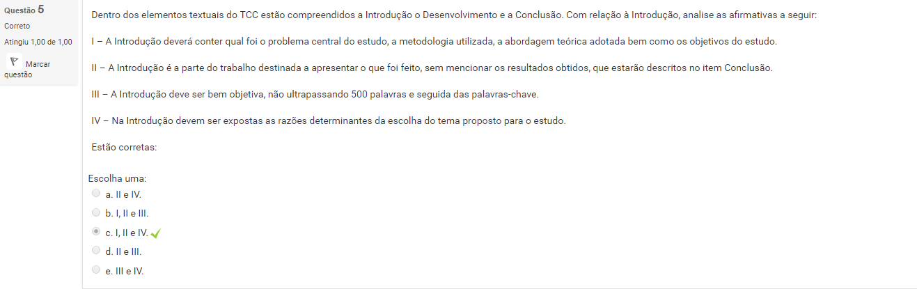 5 Dentro dos elementos textuais do TCC estão compreendidos a Introdução o Desenvolvimento e a Conclusão. Com relação à Introdução, analise as afirmativas a seguir: