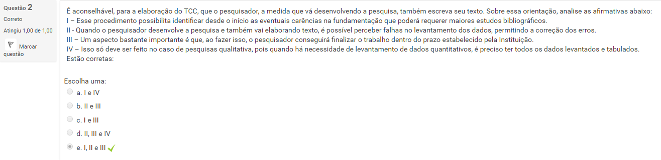2 É aconselhável, para a elaboração do TCC, que o pesquisador, a medida que vá desenvolvendo a pesquisa, também escreva seu texto. Sobre essa orientação, analise as afirmativas abaixo: