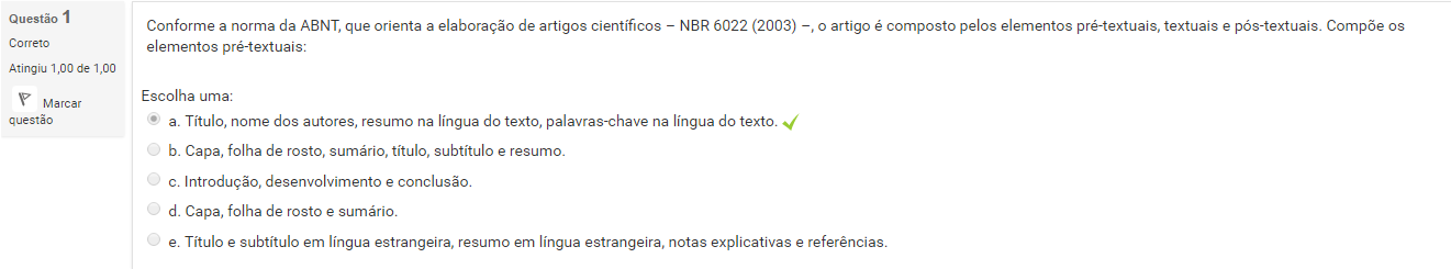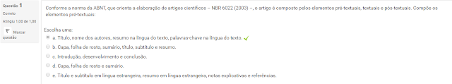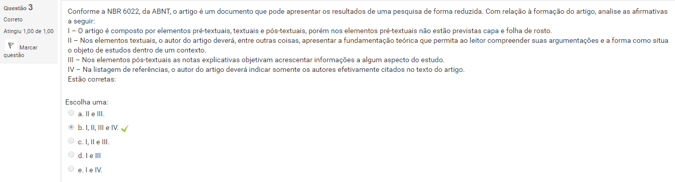 3 Conforme a NBR 6022, da ABNT, o artigo é um documento que pode apresentar os resultados de uma pesquisa de forma reduzida. Com relação à formação do artigo, analise as afirmativas a seguir: