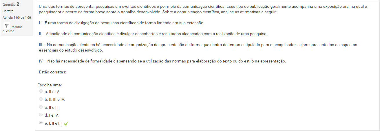 2 Uma das formas de apresentar pesquisas em eventos científicos é por meio da comunicação científica. Esse tipo de publicação geralmente acompanha uma exposição oral na qual o pesquisador discorre de forma breve sobre o trabalho desenvolvido. Sobre a comunicação científica, analise as afirmativas a seguir:
