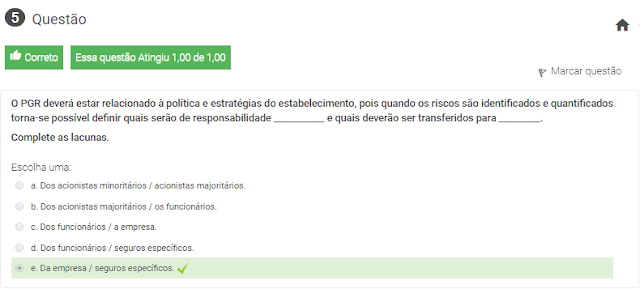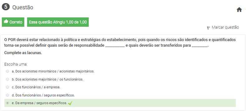 5 O PGR deverá estar relacionado à política e estratégias do estabelecimento, pois quando os riscos são identificados e quantificados torna-se possível definir quais serão de responsabilidade ___________ e quais deverão ser transferidos para _________.