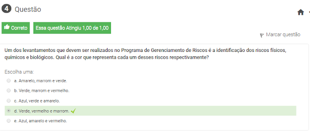4 Um dos levantamentos que devem ser realizados no Programa de Gerenciamento de Riscos é a identificação dos riscos físicos, químicos e biológicos. Qual é a cor que representa cada um desses riscos respectivamente?