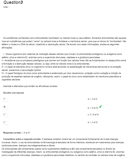 I - Nosso organismo tem sistemas de inativação desses radicais que incluem os antioxidantes endógenos (ou exógenos como selênio, zinco e vitamina E), enzimas como a superóxido dismutase, catalases e a glutationa peroxidase.